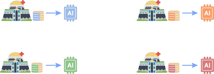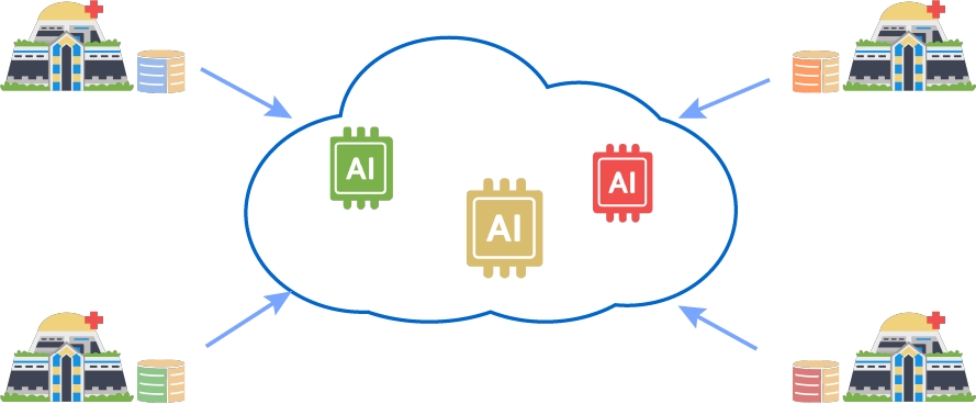 Her hastane, verilerini yapay zekaları eğiten üçüncü taraf bir platforma aktarıyor. Merkezi öğrenme, veri kaynaklarının bir yapay zeka uzmanı şirkette toplanmasına olanak tanır, ancak veriler ve araştırma sonuçları üzerindeki egemenlik hastaneler için garanti edilmez.